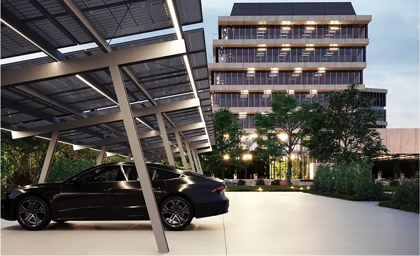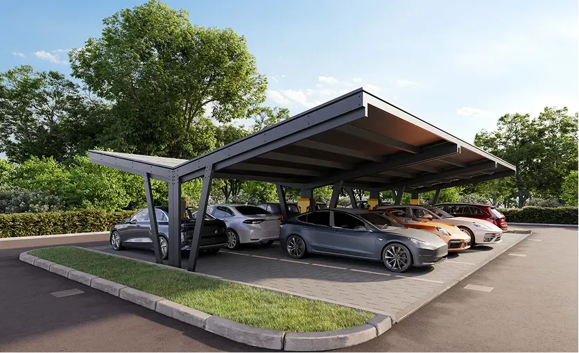 Carport współpracuje z ładowarkami EV, zapewnia maksymalną efektywność operacyjną oraz generuje oszczędności energetyczne – dbając przy tym o środowisko!